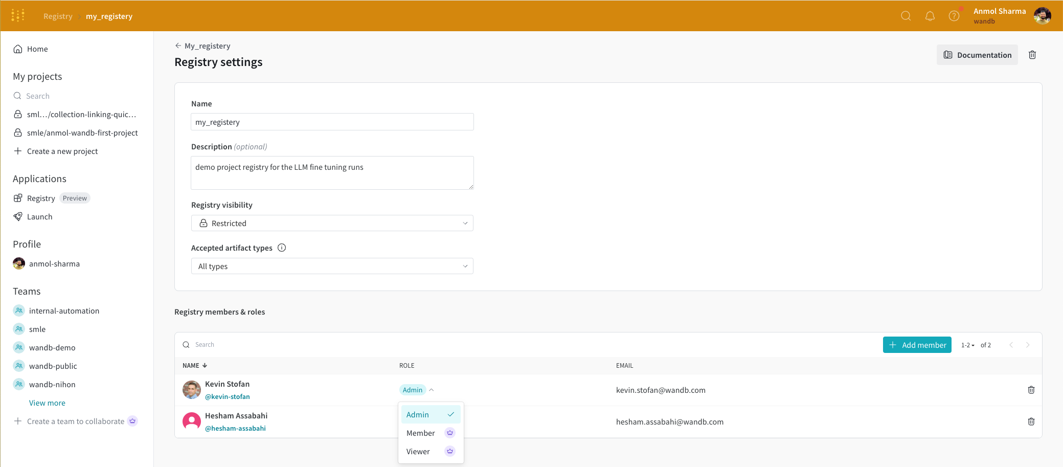 移行後、モデルレジストリは組織レベルの公開範囲を持つようになります。レジストリへのアクセスを制限するには、役割の割り当て を行うことができます。これにより、特定のメンバーのみが特定のレジストリにアクセスできるようにするのに役立ちます。